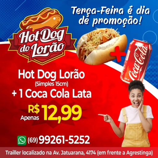 01 Hot dog lorão simples de 15cm + 01 coca lata