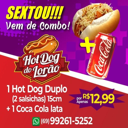 01 Hot dog duplo (02 salsichas) de 15cm + 01 coca lata